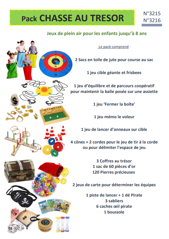 Jeux de plein air pour les enfants jusqu'à 10 ans..Le pack comprend : 2 sacs en toile de jute pour course au sac, 1 jeu cible géante et frisbees, 1 jeu d'équilibre et de parcours coopératif pour maintenir la balle posée sur une assiette, 1 jeu Ferme la boîte, 1 jeu de morpion géant, 1 jeu de lancer d'anneaux sur cible, 4 cônes et 2 cordes pour le jeu de tir à la corde ou pour délimiter l'espace de jeu, 3 coffres au trésor, 1 sac de 60 pièces d'or, 120 pierres précieuses, 2 jeux de carte, 1 piste de lancer de dé.