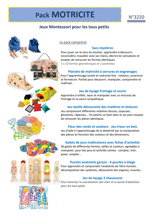 Jeux Montessori pour les tous petits :Sacs mystères, Serrures et engrenages, laçage fromage et souris, matières et textures, trieur formes et couleurs, galets, puzzle anatomie, laçage chaussures.