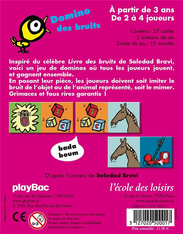 Inspiré du célèbre Livre des bruits de Soledad Bravi, voici un jeu de dominos coopératif où tous les joueurs gagnent ensemble. En posant leur pièce, les joueurs doivent soit imiter le bruit de l’objet ou de l’animal représenté, soit le mimer. Grimaces et fous rires garantis !
